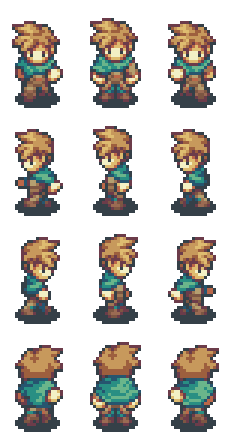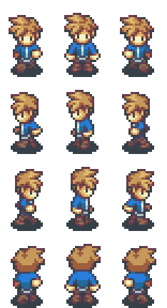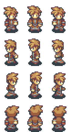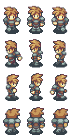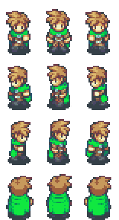 The reason why I’ve made the same character six times in different outfits is due to my character class system. Traditionally, when a character changes class, the sprite changes to one that reflects the nature of the class. For example, when a character becomes a warrior, they look as if they’re wearing metal armour; conversely, a mage would look as if they’re wearing robes. It’s primary purpose is to provide important visual information to the player.